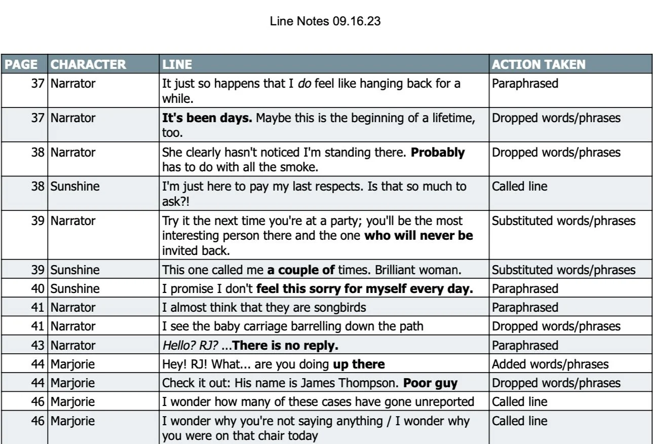 Paperwork Samples Click on images to download the full PDF View Complete paperwork portfolio here Daily Call Sample Rehearsal Report Sample Props Tracking Sample Run Sheet Sample Line Notes Sample Lights Cue Sheet Sample Fight Call Sample Run Order Sample Rehearsal Schedule Sample Weekly Call Sample Slide 1 Slide 1 (current slide) Slide 2 Slide 2 (current slide) Slide 3 Slide 3 (current slide) Slide 4 Slide 4 (current slide) Slide 5 Slide 5 (current slide) Slide 6 Slide 6 (current slide) Slide 7 Slide 7 (current slide) Slide 8 Slide 8 (current slide) Slide 9 Slide 9 (current slide) Slide 10 Slide 10 (current slide) Production Photos Bloodshot | Written by Elinor T Vanderburg | Directed by Nigel Semaj SheNYC Theatre Festival 2023 Czar Dla Domu | Written by Grace Zofia Alberti | Directed by Elliot Allen, Sil Rivera, Avery Wood SheNYC Theatre Festival 2022 (a new) blood wedding | Written and Directed by Kate DiRenzi